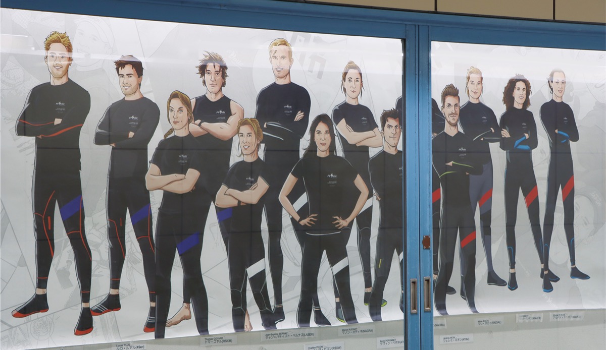 鎌倉駅地下道のギャラリーに、東京五輪に出場中のフランスセーリングチームのイラストが貼り出されている=写真。