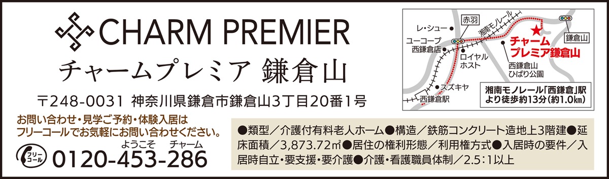昨年10月にオープンした介護付有料老人ホーム「チャームプレミア鎌倉山」で8月22日(日)、28日(土)に個別見学・相談が開催される。