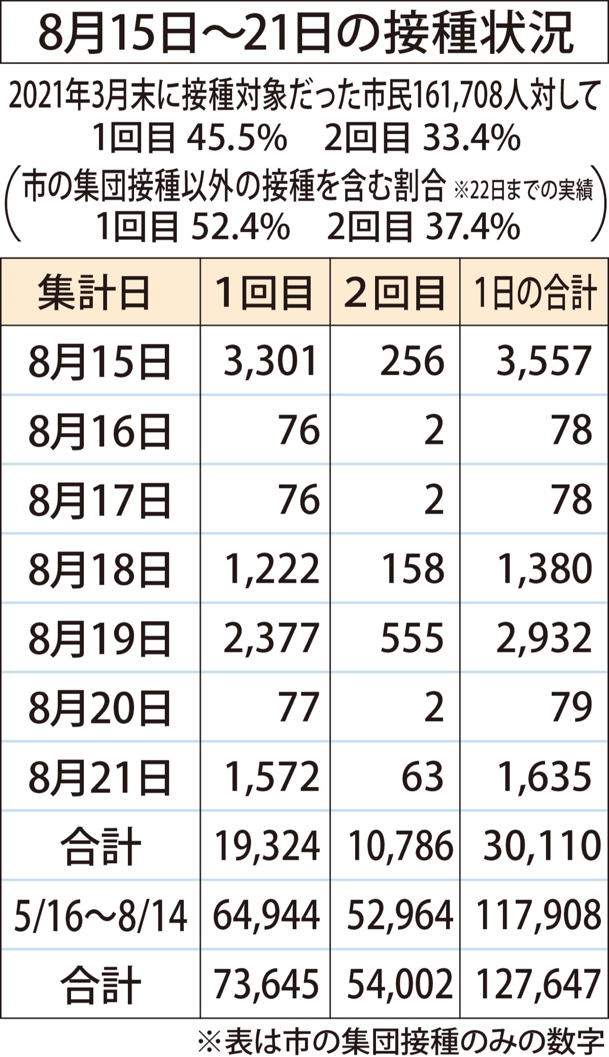 市によれば、ワクチンを接種した市民は、市の集団接種(21日まで)では1回目は7万3645人(45・5%)、2回目は5万4002人(33・4%)。国の大規模接種や職域接種などを含める(22日まで)と接種割合は1回目が52・4%、2回目は37・4%=下表。