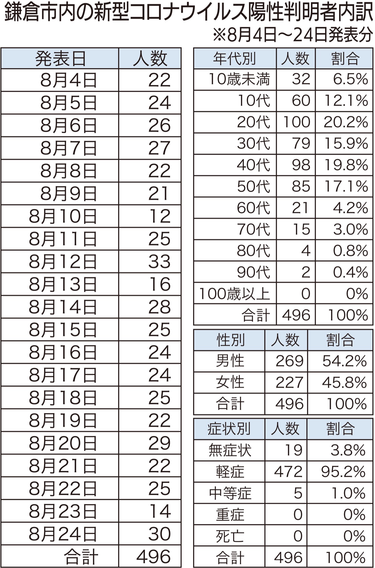 8月4日〜24日の21日間に発表された鎌倉市内の新型コロナウイルス陽性判明者は、10歳未満から90代の男女496人で、累計1774人となった。過去最多だった7月の感染者数347人を8月は16日時点で上回るなど、感染拡大が止まらない。 (25日起稿)