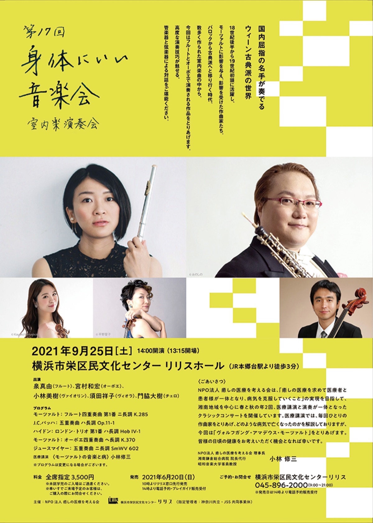 NPO法人「癒しの医療を考える会」による公演「第17回 身体にいい音楽会」が9月25日、横浜市栄区民文化センターリリスで開かれる。午後2時開演。