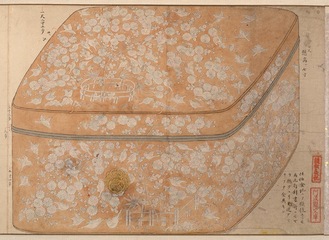 写真は「籬菊螺鈿蒔絵(まがききくらでんまきえ)手箱図巻(政子手箱図)=鎌倉国宝館蔵)」。国宝・籬菊螺鈿蒔絵硯箱(鶴岡八幡宮蔵)=展示中=と対をなすと考えられる手箱の記録図。展示の硯箱は源頼朝が自身で同宮に奉納したと伝わる。一方、手箱は現存せず、北条政子の所持品であったとの伝承が残る。