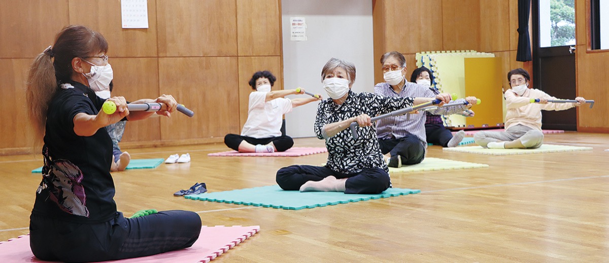 9月9日、今泉さわやかセンター。毎月2回活動する 「リズム体操同好会」のメンバーたちが、清水さんのグリップ健康バーを両手に握り、体を上下左右に動かす。さらに、バー先端の球体で肩を叩いたり、グリップ上のローラー部分を踏んで足裏をマッサージしたり。