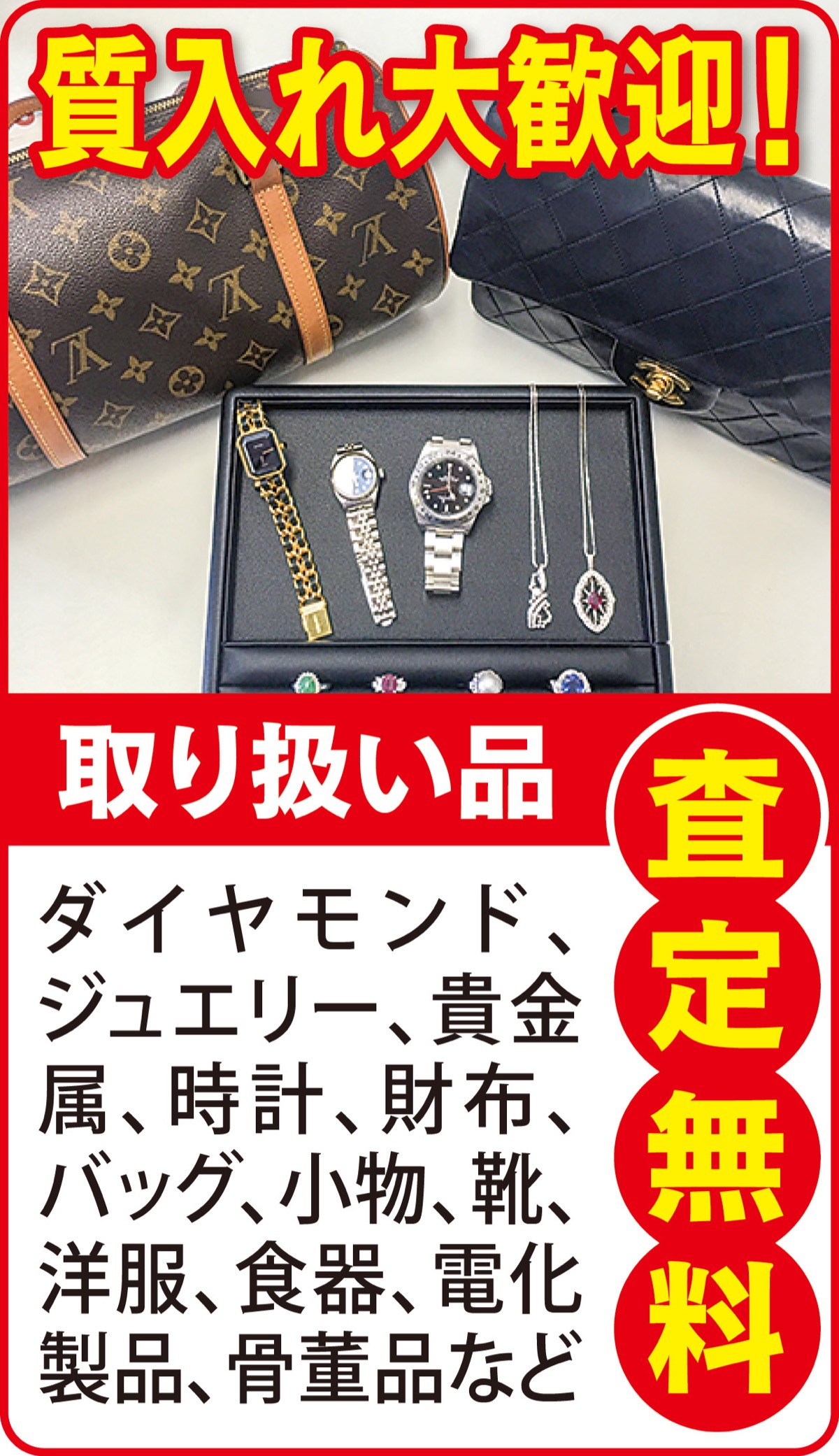 目利きの質屋が行う無料査定。同店は、「お客様が大切にされてきたものなので、しっかり見させて頂きます」と語る。貴金属やブランドバッグ・財布などの中古市場価格が高止まりする現在は、ブランド品の現行人気モデルは定価以上の買取が可能な場合も。無料出張買取、同店が送料負担の宅配買取も実施中。