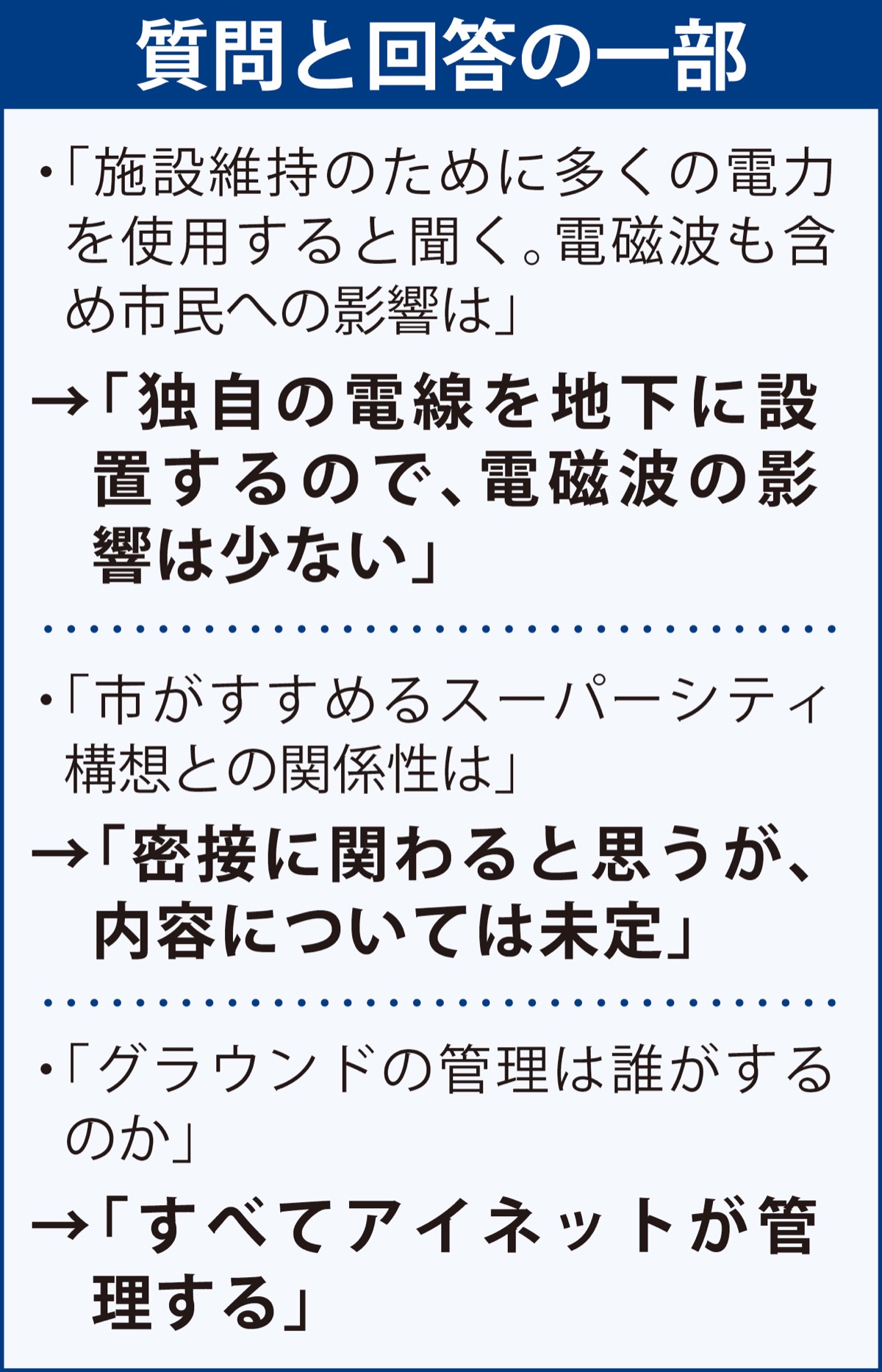 参加者からは事業内容に関する質問のほか、グラウンドや散策路の利用継続を望む声も多くあった。質問の「就業人数」については、「数十人から50人程度」との回答があり、「大量に使用する電力」は「東京電力と調整中で、家庭用とは違う送電線を地下に敷設する予定。電磁波の影響も少ない」と答えた。また同所が5Gの基地局になることについても否定し、「そういう予定はない」とした。