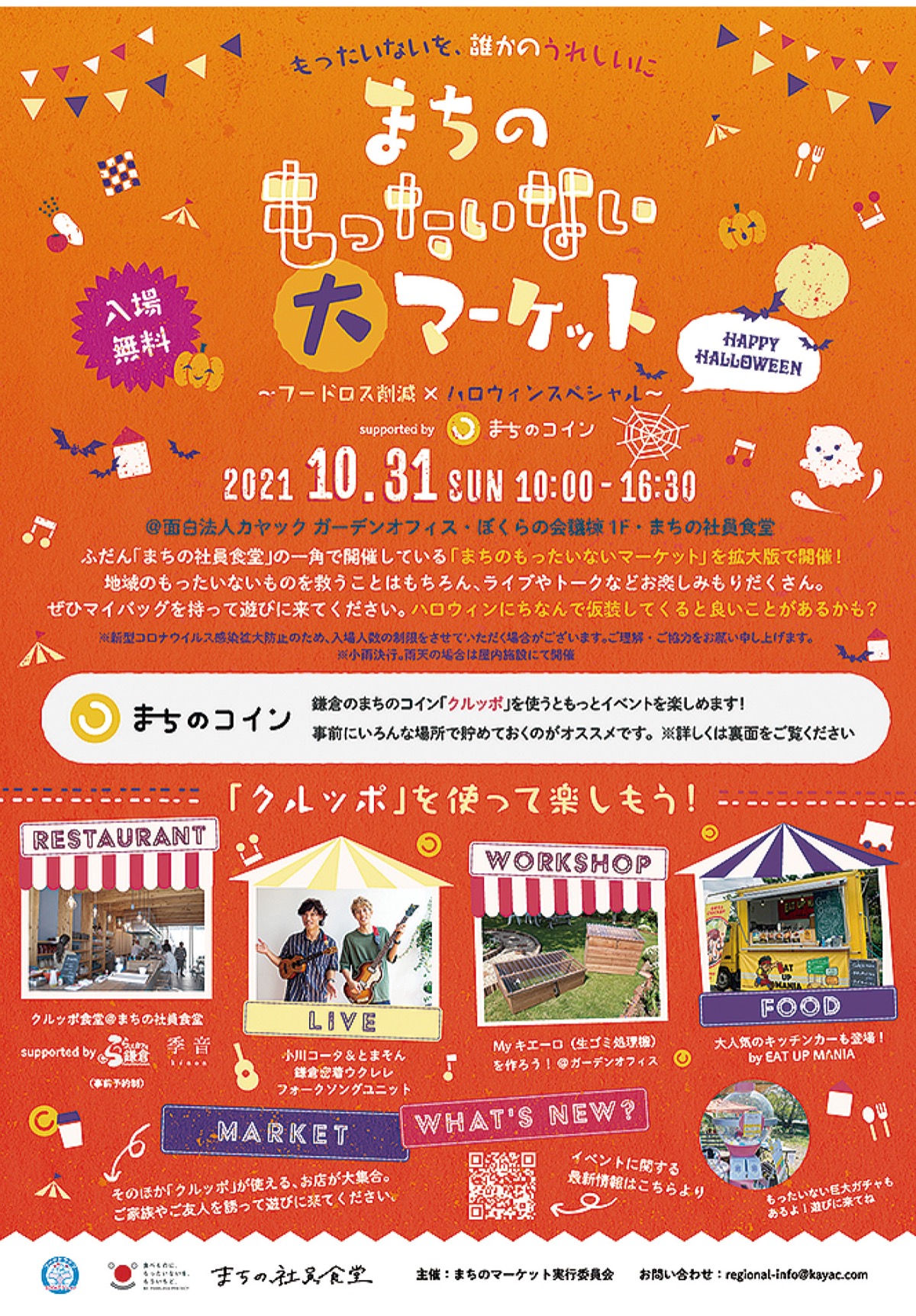 「まちのもったいない大マーケット」と題し、カヤックの社員などで構成する実行委員会によって企画された今回のイベント。規格外野菜の販売、紙を自分で貼る金魚すくい、学校教材やハロウィン衣装の回収・交換、量り売りマルシェなどが予定されている。さらに、ステージでのウクレレ演奏や生ごみ処理機を作るワークショップ、キッチンカーの出店などもあり。