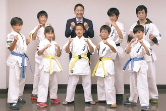 白蓮会館湘南鎌倉支部では、今春から秋にかけて実施された関東地区予選などを9人が突破し、11月23日(火・祝)に大阪で開催される全日本大会の出場権を獲得。清水怜央選手(金井高1年)と石原翔選手(片瀬中1年)を除き、野見山嘉瞳(かどう)(栄光学園中2年)・然宇(さりゅう)(七里ガ浜小3年)兄弟、樋本涼(手広中2年)・楓(深沢小4年)兄妹、波木井春陽選手(腰越小4年)、泉心選手(西鎌倉小3年)、佐藤絆太選手(西鎌倉小3年)の7人が市役所を訪れた。