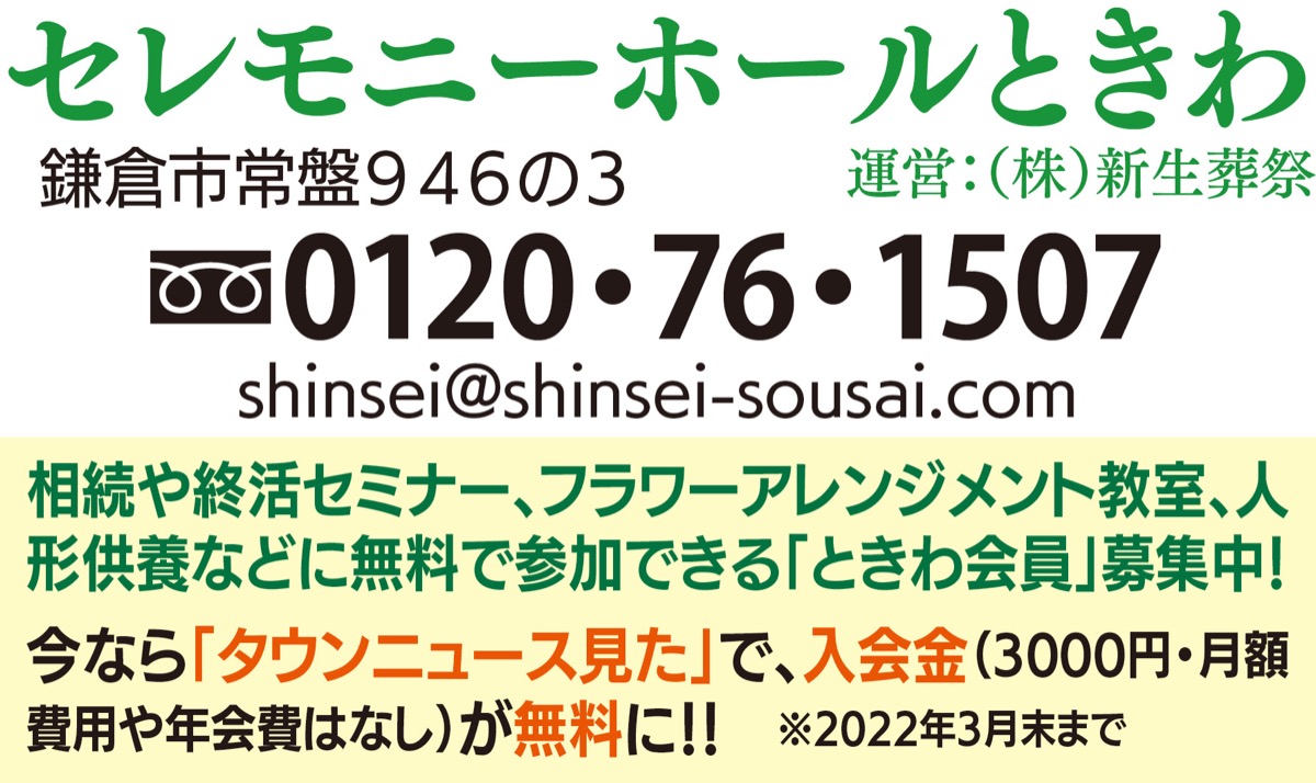 「とても丁寧な対応と親切な説明のおかげで、安心して葬儀まで過ごすことができました」、「心に残る葬儀をしていただき、家族だけでなく親戚も感謝していました」。市内常盤の葬祭式場「セレモニーホールときわ」には、利用者からこのような声が寄せられている。