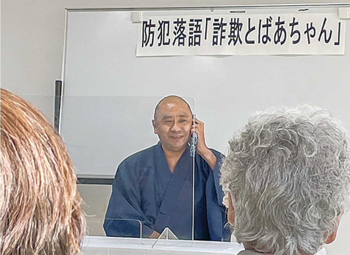 会場となったのは、今泉台町内会館。地域の中高年が集う元気会の中で、自作落語「詐欺とばあちゃん」を口演。犯人とおばあさん、タクシー運転手が登場し、特殊詐欺の手口を分かりやすく紹介し、笑いとともに防犯を呼びかけた。参加者は「最後にオチもあり、楽しく聞けた。笑うばかりでなく気をつけたい」と話した。