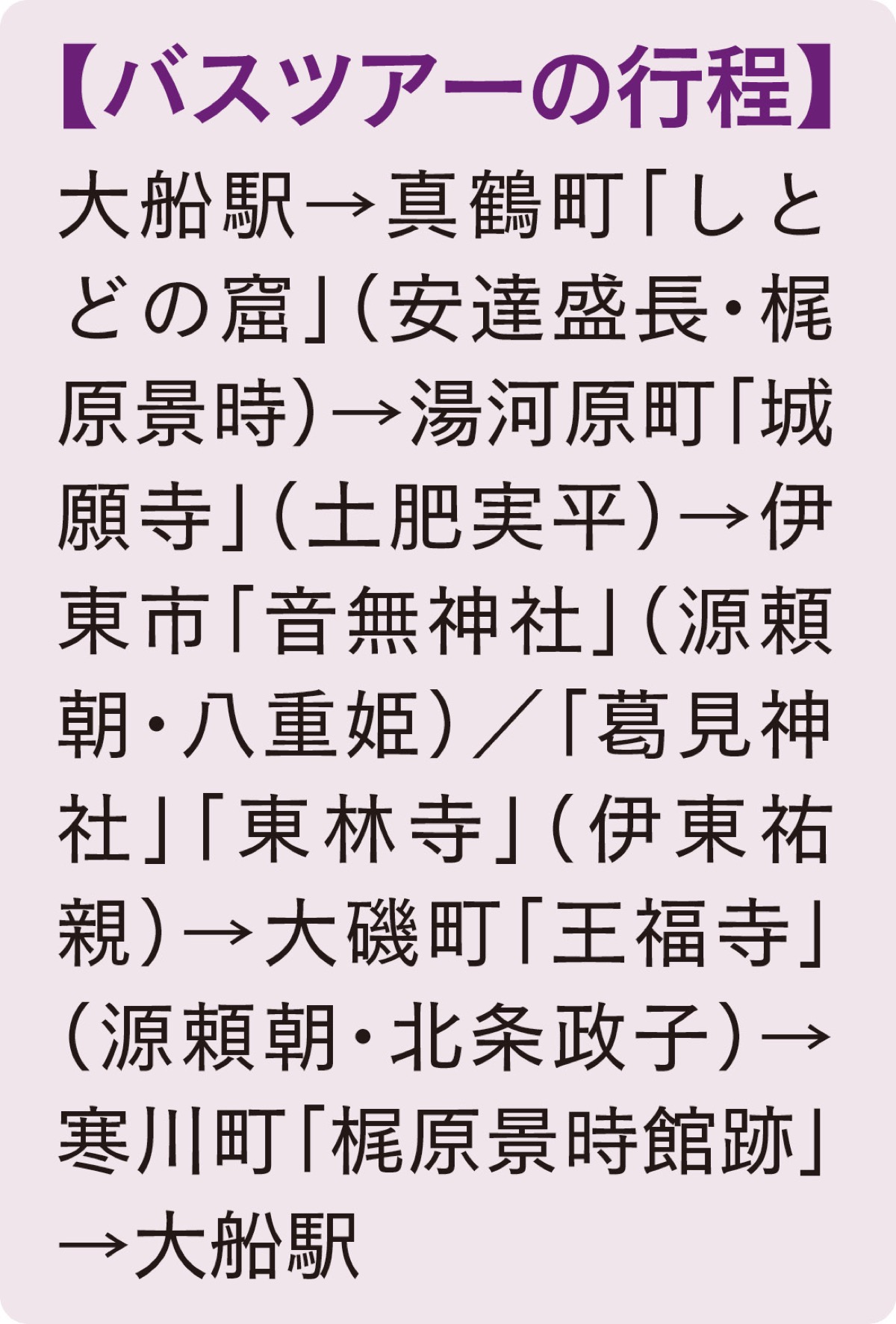 今回で13回目を数える「鎌倉検定市民の会」主催のバスツアーには、25人が参加した。検定合格者をはじめ、大河ドラマ放映前に知識を深めておきたいという市民らを乗せた一行は、神奈川県内、さらには静岡県まで足を伸ばした。