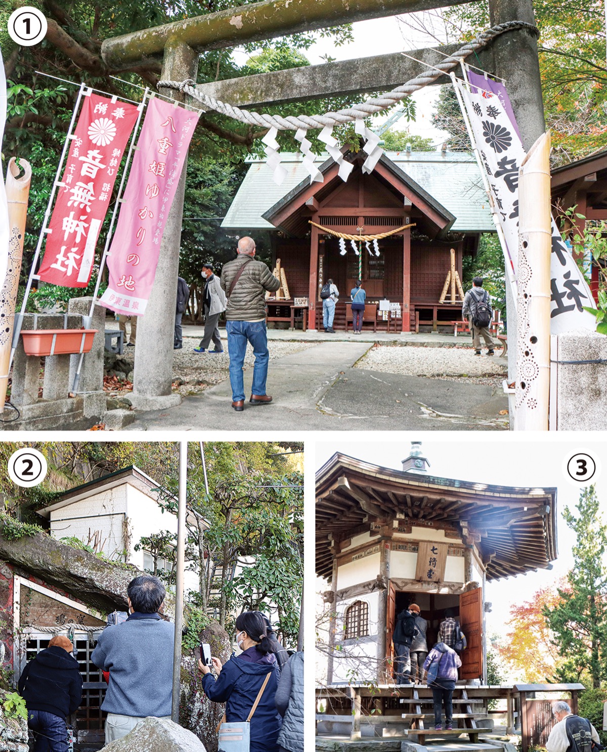 続いて、石橋山の戦いに敗れて頼朝とともに逃げた7騎が祀られる「七騎堂」(湯河原町・城願寺)=写真【3】=へ。ほかにも、伊東祐親の娘・八重姫と頼朝が密かに会っていた場所とされる静岡県伊東市の「音無神社」=写真【1】=などを巡った。北条政子の安産を祈願したと伝わる大磯町「王福寺」では、普段は公開していない薬師如来像を見物。検定1級取得者の材木座在住・伊藤千津江さん(76)は、「個人で行っても見られないようなものがツアーではお目にかかれる」と声を弾ませ、毎回のように参加している。