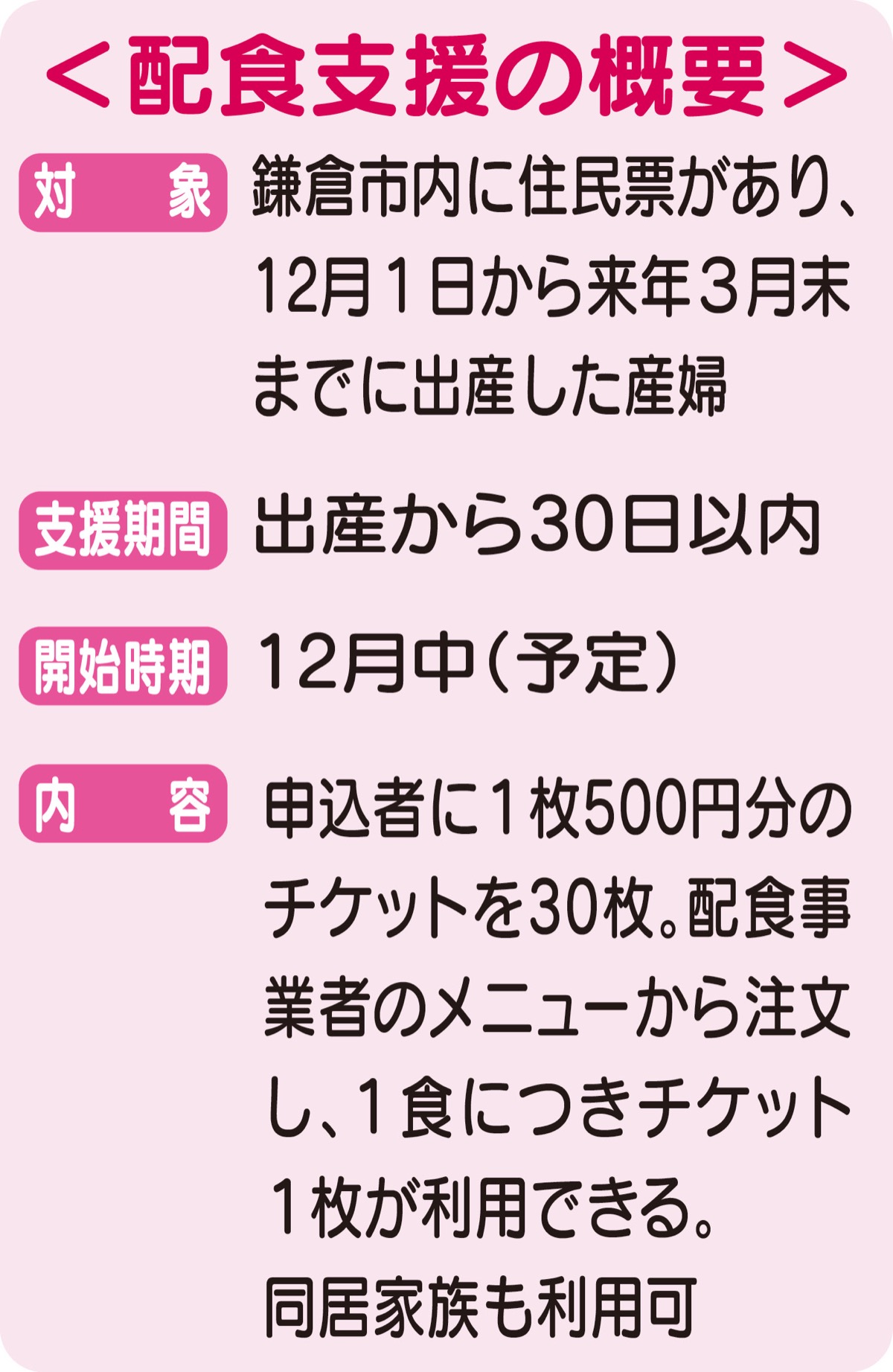鎌倉市は、出産から30日以内の産婦に、弁当タイプの配食支援サービスを12月中に開始する。コロナ禍で里帰りできなかったり、親族が手伝いに来られなかったりと産婦がサポートを受けるのが難しい中、市は感染予防対策として初めて実施する。