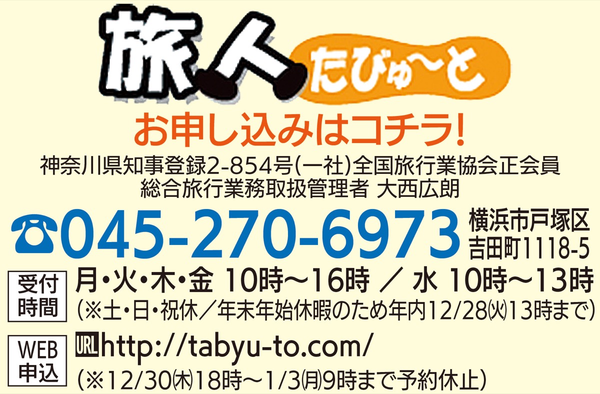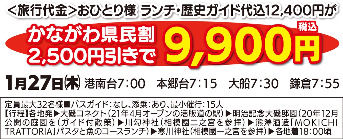 旅行代金がお得になるかながわ県民割で神奈川の魅力を再発見の旅。オーダーメイド旅行でおなじみの旅人(たびゅ〜と)が1月27日(木)に日帰りバスツアーを開催する。地元発着で相模國一之宮と二之宮を巡るコースランチ付き初詣旅。