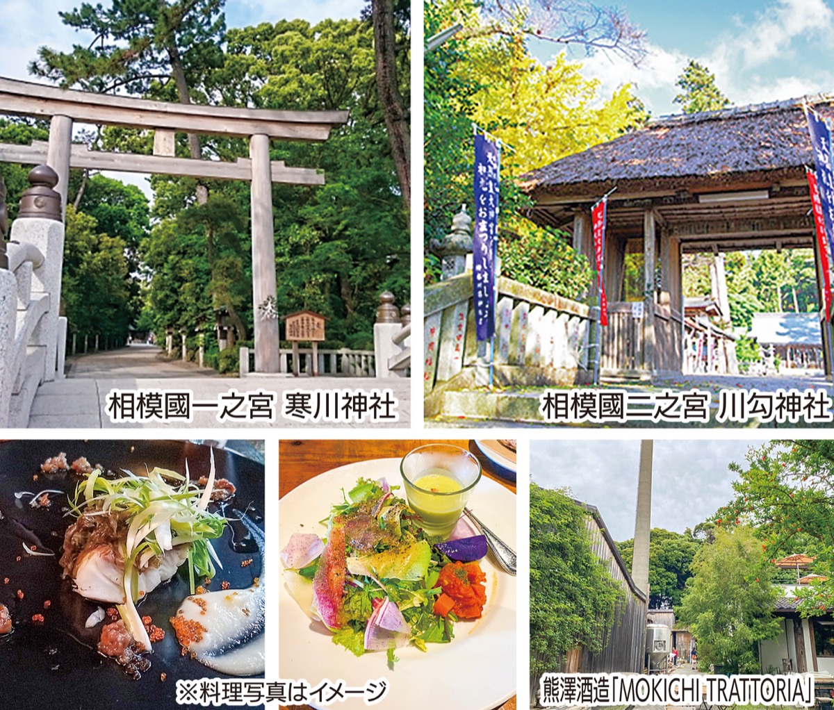当日は大磯で新しくオープンした2施設、港版道の駅「大磯コネクト」と偉人ゆかりの「明治記念大磯邸園」を楽しみ、意外と知られていない相模國二之宮「川勾神社」を参拝。その後湘南唯一の酒造・熊澤酒造直営の人気古民家イタリアン「MOKICHI TRATTORIA」で少し贅沢なコースランチを。自然あふれる非日常な空間で舌鼓を打った後は、相模國一之宮「寒川神社」で参拝。新年の始まりにふさわしい旅をぜひ。