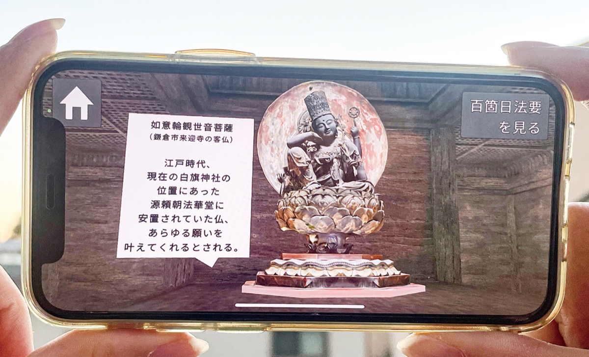 現地に建物は残っていないが、看板にある二次元コードを読み込むことで実際の風景の中にCGで再現した建物が表示される。そのまま近づいていくと建物内部を見ることが可能で、中には頼朝の法華堂にあったものを基にCG化した仏像が安置されている様子も再現。建物の構造や仏像の解説も表示され、百箇日法要をイメージした音声を楽しむこともできる。