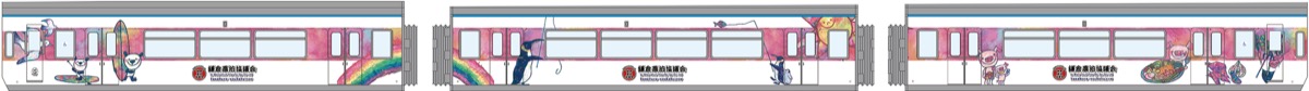 鎌倉の海や農産物を楽しむ動物の姿を描いたラッピング車両が、湘南モノレールに登場した。これは鎌倉農泊協議会が鎌倉駅から少し足をのばした場所も観光してもらいたいと実施している観光庁の採択事業の一環。イラストを手掛けたのは、鮮やかな色使いの作品を描き続ける腰越在住のアーティスト、かおかおパンダさんだ。=人物風土記で紹介。