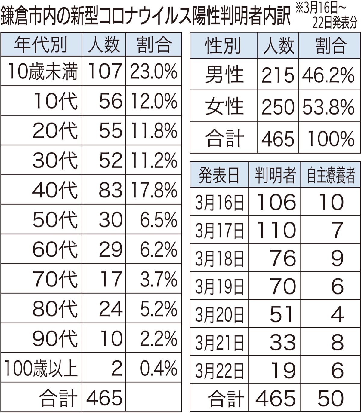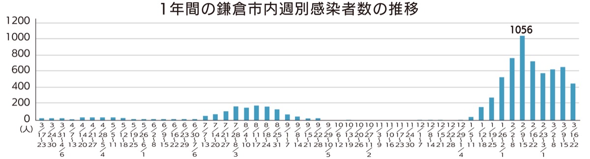 3月16日〜22日の7日間に発表された鎌倉市内の新型コロナウイルス陽性判明者は、10歳未満から100歳以上の男女465人で、累計8038人となった。まん延防止等重点措置は21日で解除されたが、市内の感染者数は昨夏の第5派のピークを大きく上回る日が依然続いている。