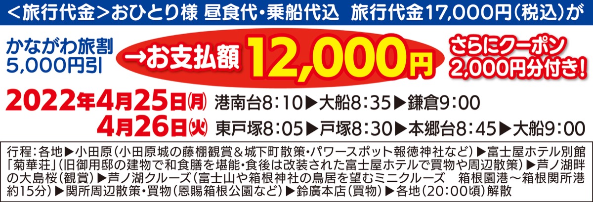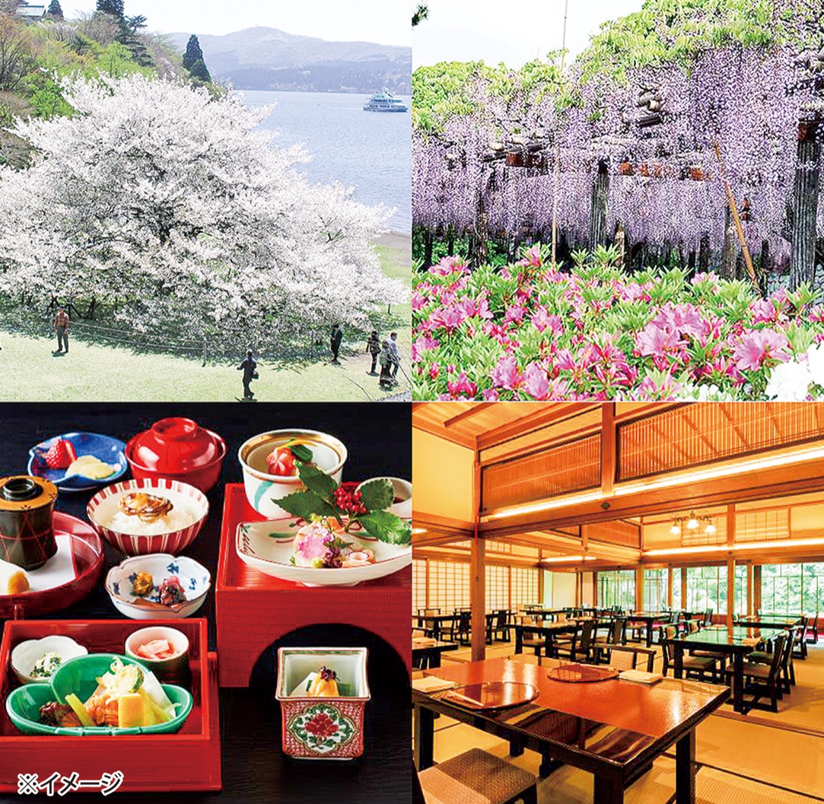 大船、鎌倉、戸塚駅などからツアースタート。まずは小田原城で藤棚観賞と城下町・パワースポット報徳神社を散策し、富士屋ホテル別館「菊華荘」の旧御用邸の建物で和食膳を堪能。食後はホテルで買物や周辺散策を。その後は芦ノ湖畔の大島桜を眺め、富士山や箱根神社の鳥居を望む箱根園から関所までの芦ノ湖クルーズを楽しむ。最後は小田原の名店「鈴廣」を訪ね、各地で解散の流れだ。