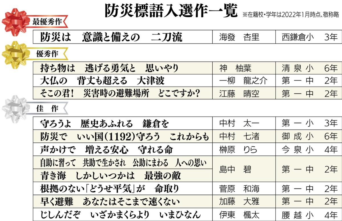 鎌倉大船ロータリークラブ(RC)が市内小・中学生を対象にした防災標語募集で、海發(かいはつ)杏里さん(西鎌倉小・応募当時3年)の「防災は 意識と備えの 二刀流」が最優秀作に選ばれた。