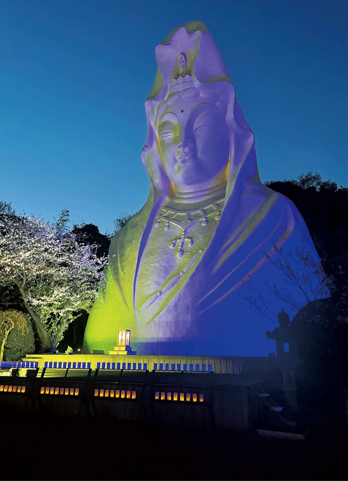 ロシアのウクライナ侵攻を受け、大船観音寺と同寺護持会、防犯団体の鎌倉ガーディアンズが支援活動を企画。ライトアップは20日(水)までの日没から午後8時まで行われ、大船観音寺内に募金箱も設置している。