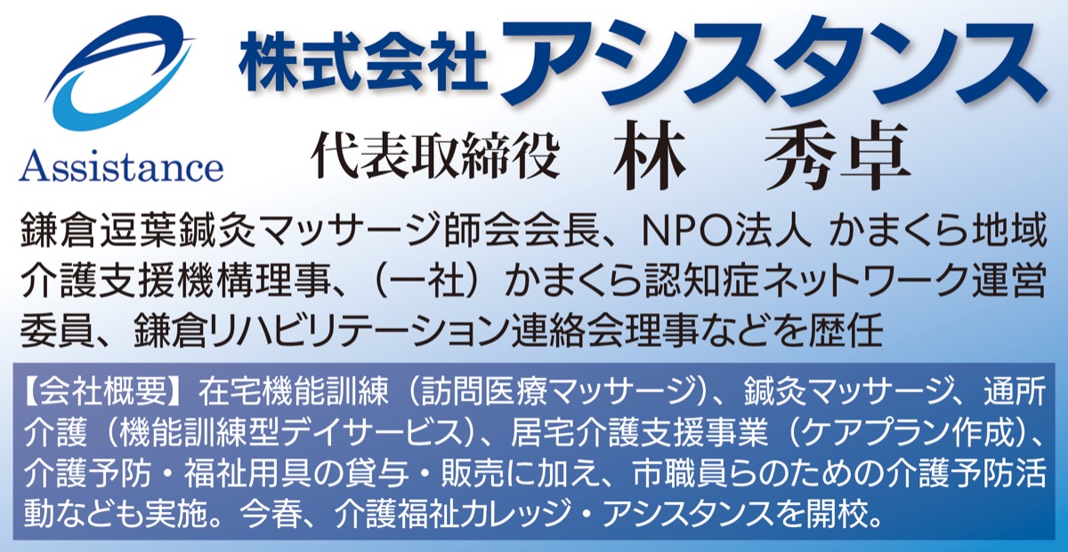 市内岡本に事務所を構える株式会社アシスタンスが今年8月に創立20周年を迎える。誰もが住みやすい地域を共につくる「共生社会の共創」を理念に、地元・鎌倉市をはじめとした湘南エリアで介護に関する複数の事業を展開してきた。