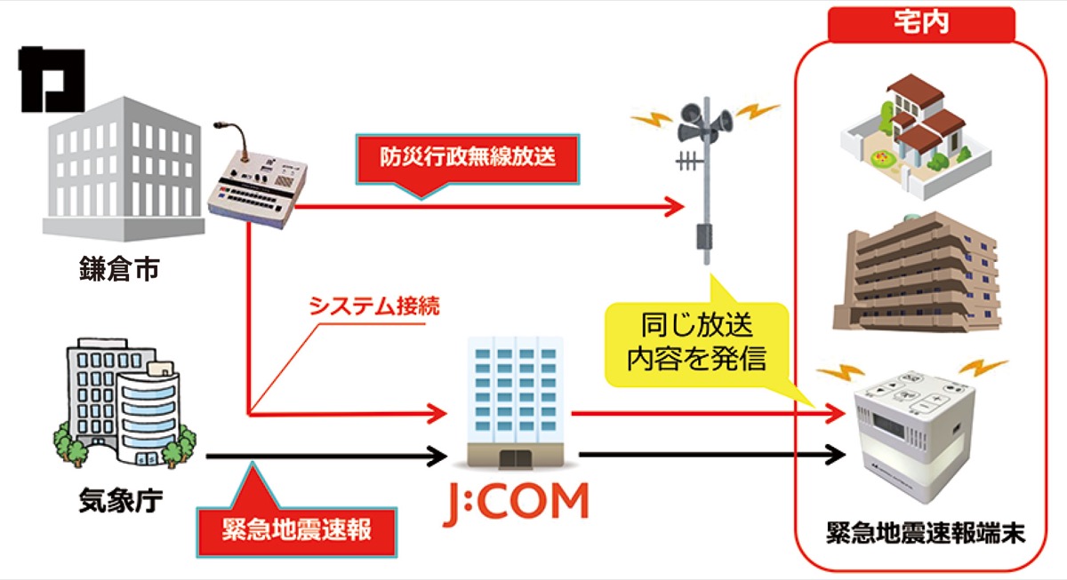 今回の仕組みは、災害時など市が防災無線で流す音声情報を、ジェイコムの緊急地震速報端末を通じて、自宅など屋内にいる市民にも情報が届きやすくする。気象庁の緊急地震速報も配信。同社によると、防災無線で発信された数秒後に、端末から同様の内容が流れる。端末は、ジェイコムで提供している。