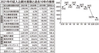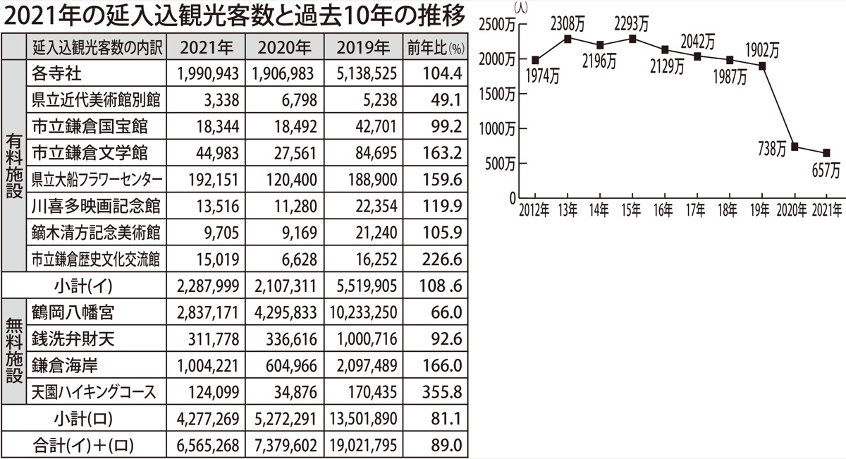 鎌倉市は5月30日、2021年中に市内を訪れた観光客の推定延べ人数が約657万人だったと発表した。