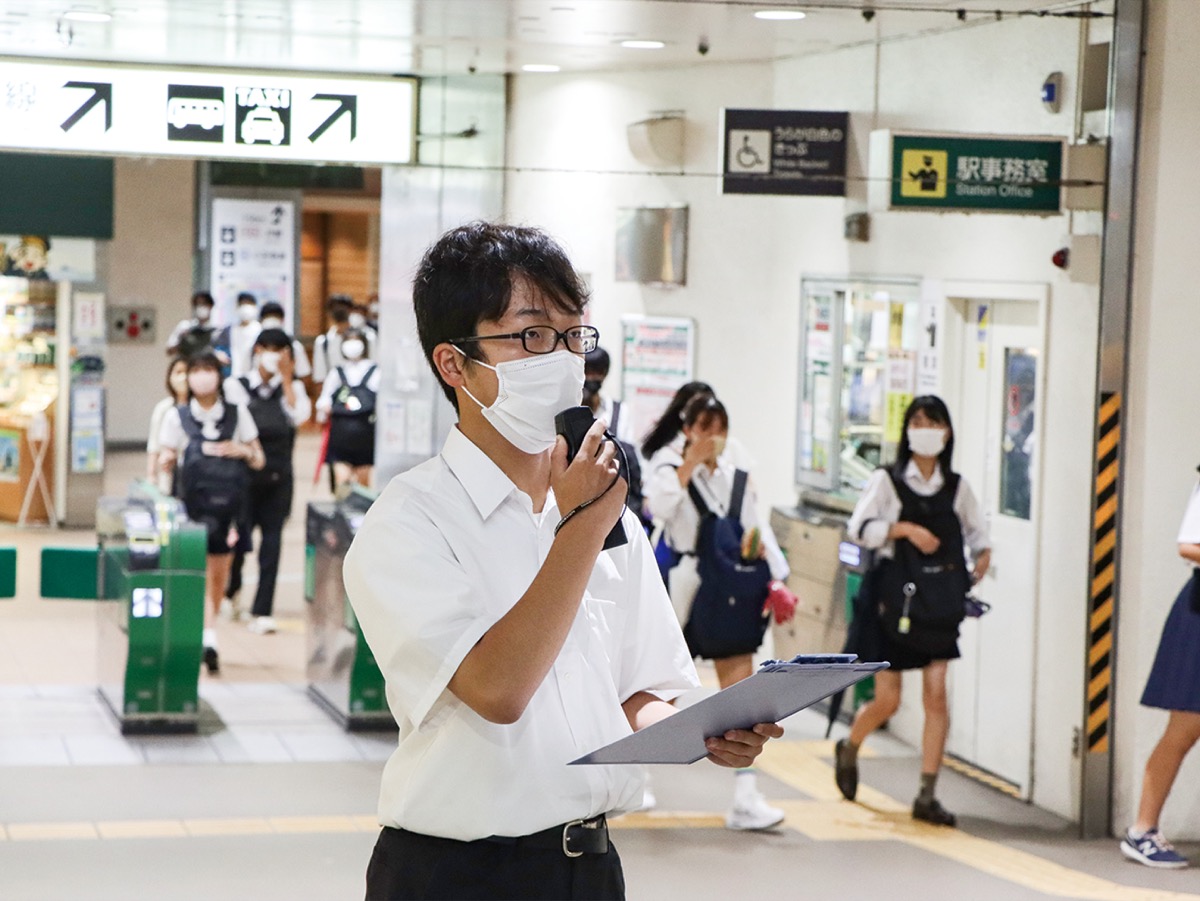 鎌倉高、七里ガ浜高生の通学利用がピークを迎える午前8時前後、初々しいアナウンスが構内に響く。学校の友人も通学していく中、鎌倉高放送部の中澤颯一さん(2年)と加藤風花さん(1年)、七里ガ浜高生徒会の西舘小鞠さん(3年)と安江皓祐さん(3年)が放送マイクを握った。かばんは前に抱えるか網棚の利用、感染症防止対策として車内での会話を控えめにしてもらえるよう利用客へ呼びかけた。