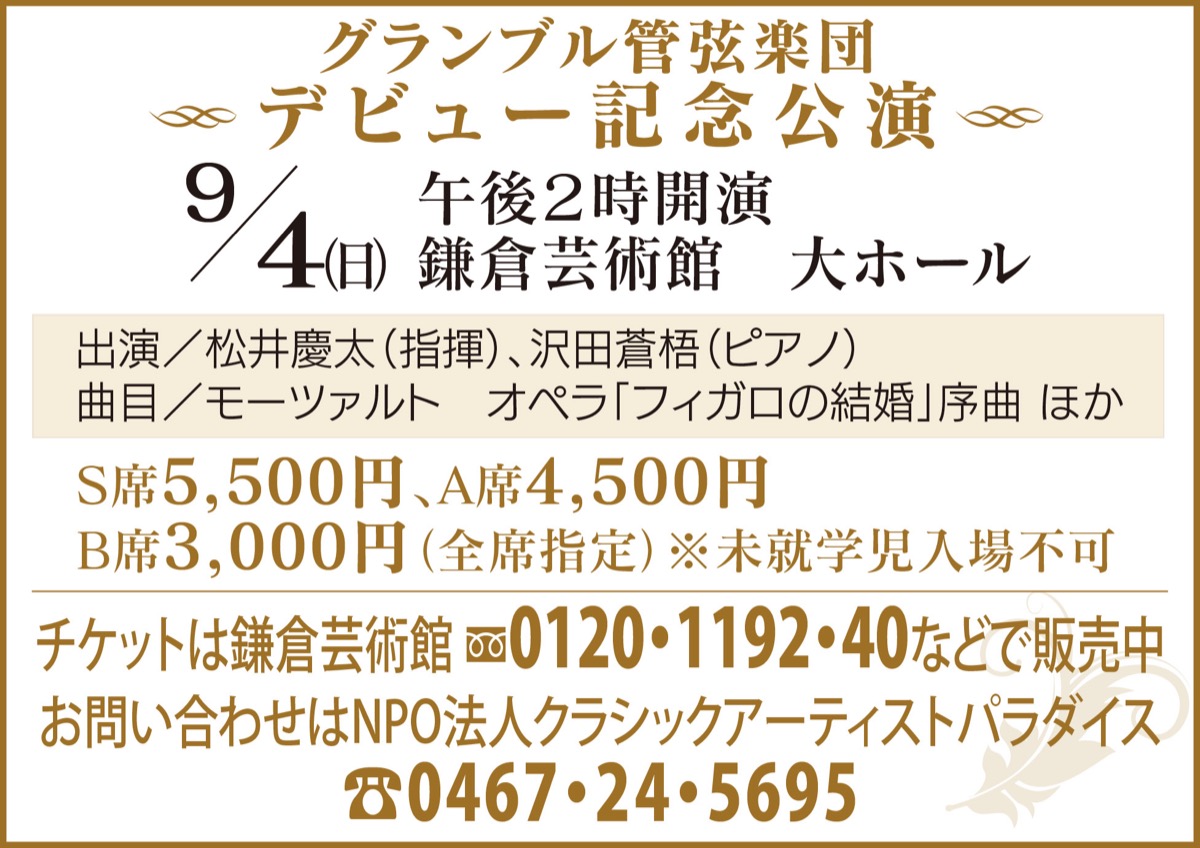 ショパンコンクールでは、残念ながらコンチェルトが弾けるファイナルまで進めなかったため、私たち聴衆は、沢田さんの弾くコンチェルトを聴く機会を失った。しかし、今回、当法人が立ち上げた「グランブル管弦楽団」のデビュー公演で、沢田さんがショパンのピアノ協奏曲1番を演奏してくださることになった。若手指揮者である松井慶太さんによる、「のだめ」で有名になったベートーヴェン交響曲第7番も楽しみである。