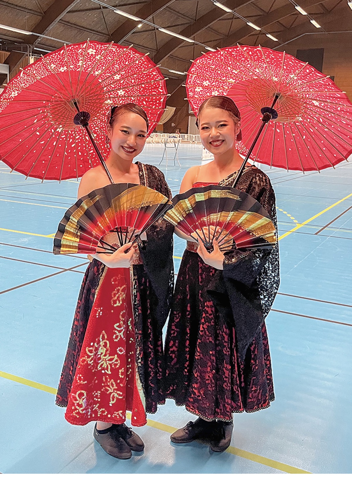 橋本・小木ペアは「和」をテーマに、和傘や扇子の小道具も使ってジャンプや高速スピンと車輪上で躍動。「5回連続でできるまで休憩しない」(橋本さん)と練習を繰り返した、I字バランスの小木さんを橋本さんが背走しながら牽引する大技=写真=も成功させた。落車による減点はあったものの、演技点と技術点で最高点を記録し世界の頂点に立った。