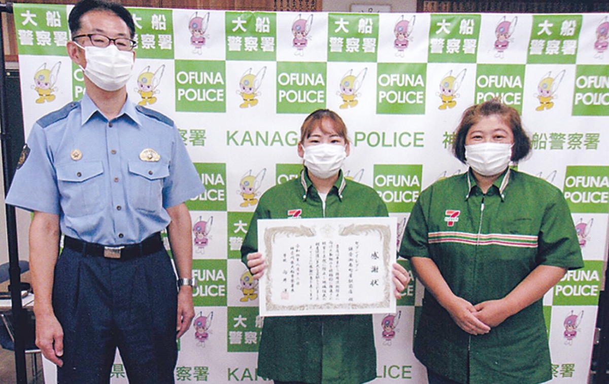 大船警察署は8月12日、特殊詐欺を阻止したとして、セブンイレブン鎌倉湘南町屋駅前店の蔵並菜緒美さん(27)に感謝状を贈呈した。