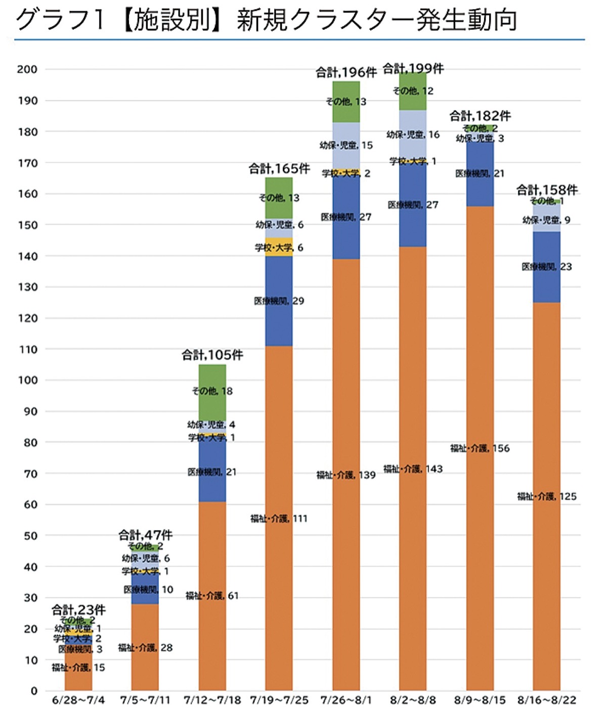 新型コロナの感染拡大により、介護事業者から悲鳴があがっている。第7波によって、クラスターも相次いで発生。神奈川県が公表する県内全域の新規クラスター発生動向によれば、直近のピークとなった8月2〜8日は、199件のうち、介護・福祉事業者が7割を超えた。積極的疫学調査の優先対象が医療機関や高齢者施設だったり、学校が夏休みだったりという背景もあるが、介護事業者の施設運営や事業経営に支障をきたす事態となっている。