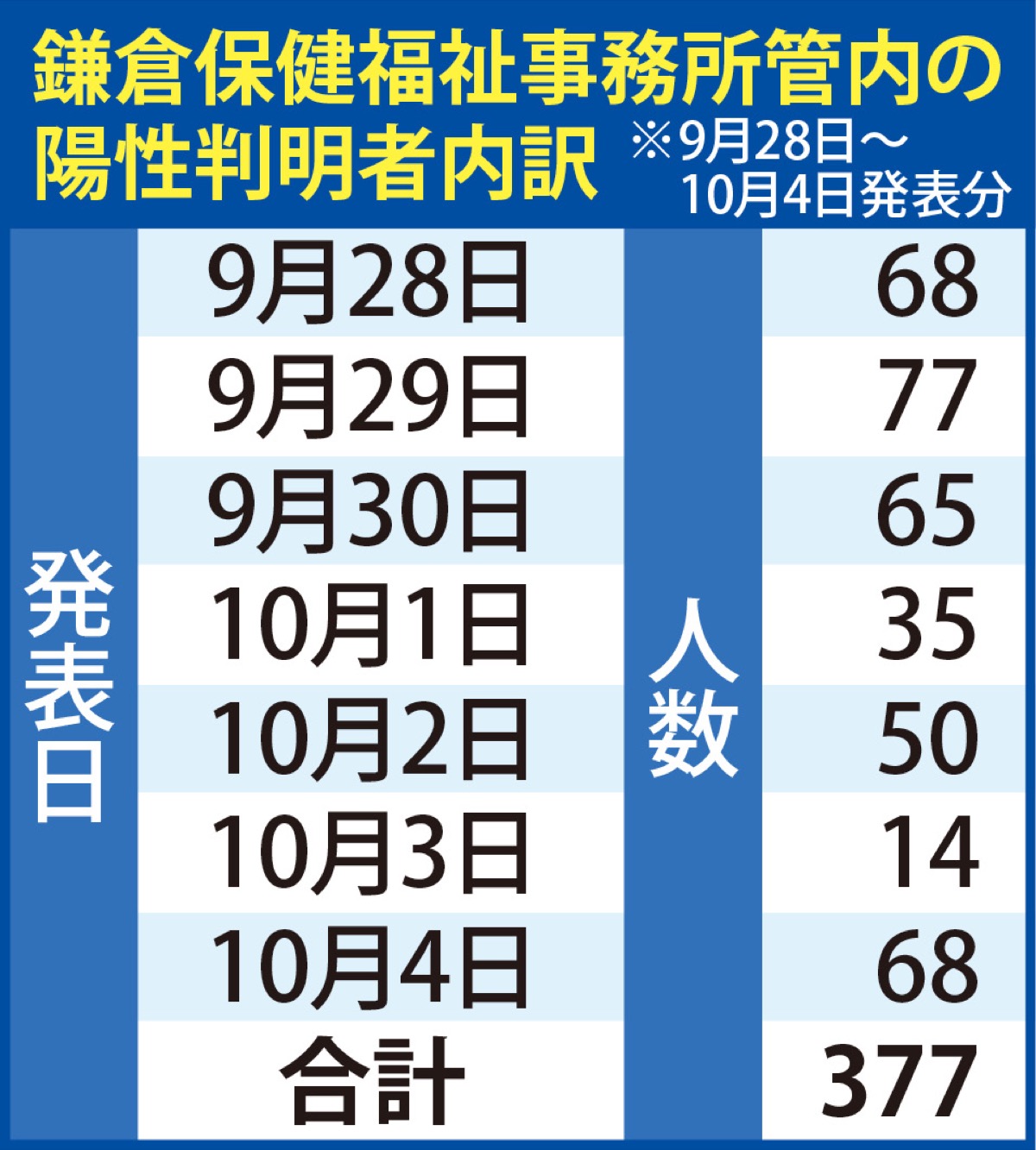 9月28日〜10月4日の7日間に発表された鎌倉保健福祉事務所管内の新型コロナウイルス陽性判明者は、10歳未満から90代以上の男女377人だった。そのほかに、自己検査で陽性となり県の「陽性者登録窓口」に登録した市内居住者は49人だった。