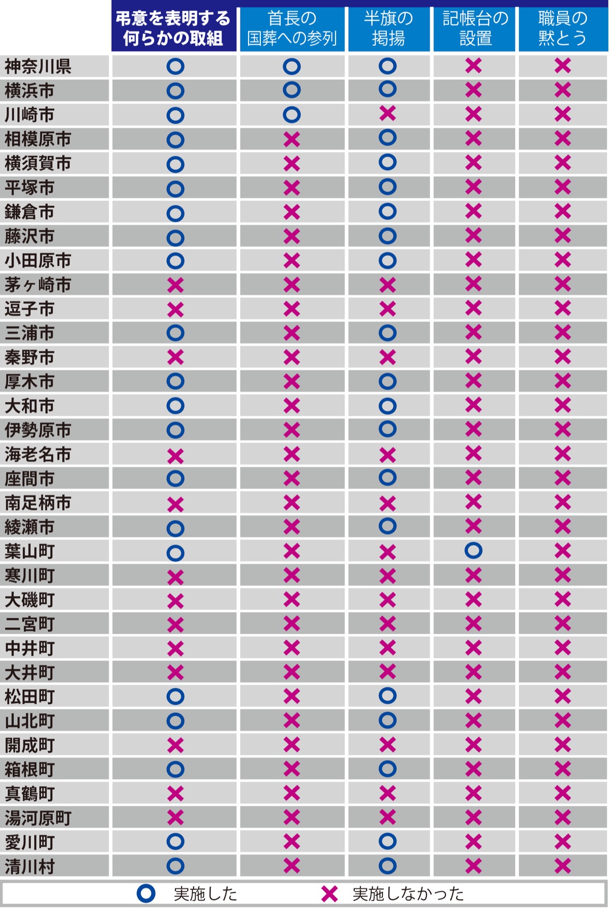 自治体として弔意表明に関する規定や基準を設けているのは川崎市と大和市の2市だった。