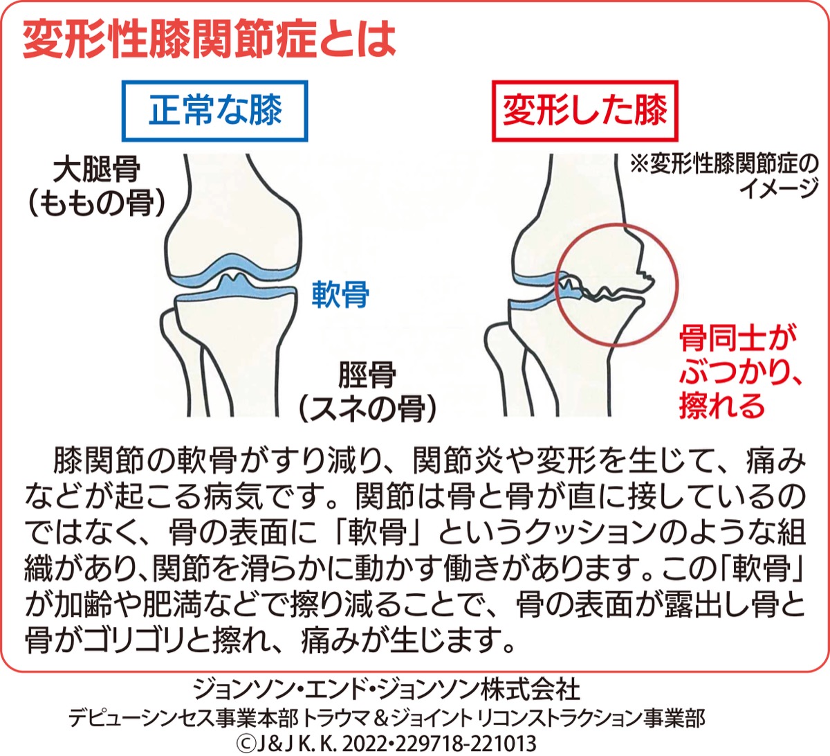 「人工膝関節手術」は国内で年間8万件以上行われている確立された手術です。手術に対する不安は大きいと思いますが、手術後は歩くスピード、歩幅が変わり、体力的に回復し筋力がついてくると「歩けるようになった」と実感する方が多いです。「行動範囲が広がった」「手術してよかった」という声がよく聞かれます。