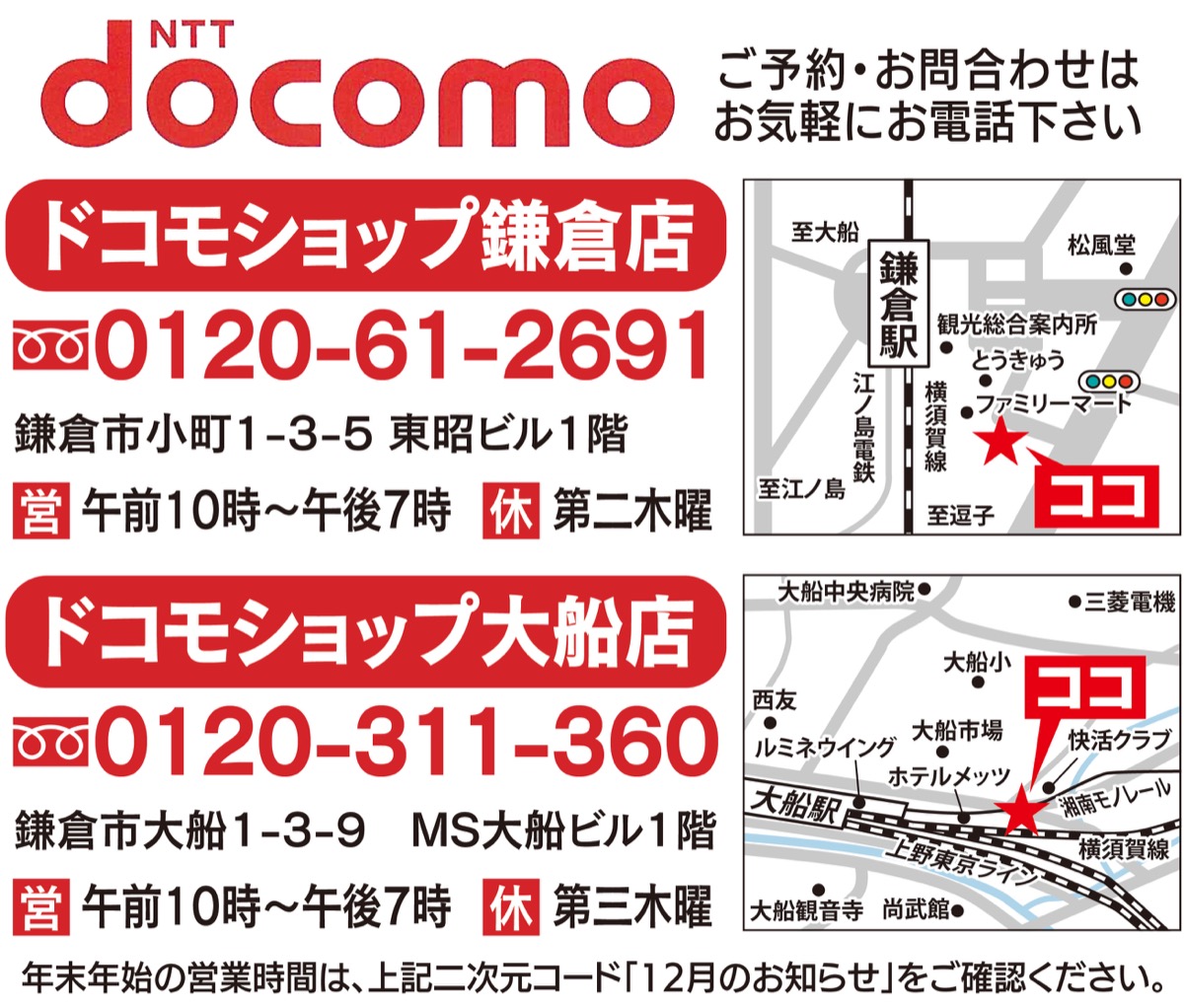 ドコモショップ大船店・鎌倉店では、「マイナンバーカード申請サポート」を実施中。最短5分で、手ぶらでも可。マイナポイントの付与は、年末までにカード申請した人が対象。ドコモ以外のキャリアでも受け付ける。混み合うことが予想されるため、12月早めの来店を。