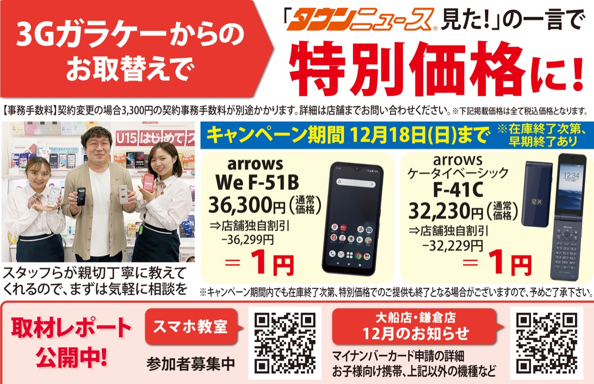 同店ではガラケーから機種変更時に「タウンニュースを見た!」の一言で、人気の携帯機種=写真=が特別価格に。「まずは気軽にお電話を」とスタッフは呼びかけている。