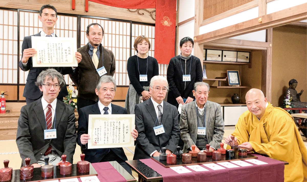 鎌倉彫とはんこ職人によって制作された「鎌倉彫御朱印」の奉納式が、鎌倉十三仏大祭に合わせて11月27日、浄光明寺(扇ガ谷)で開かれた。制作に携わった関係者ら約70人が集まり、住職による法要が行われた。それぞれ異なるデザインのオリジナル御朱印は、13の寺院へ順次納められ、参拝者への御朱印授与、十三仏巡りでの活用などを検討していく。