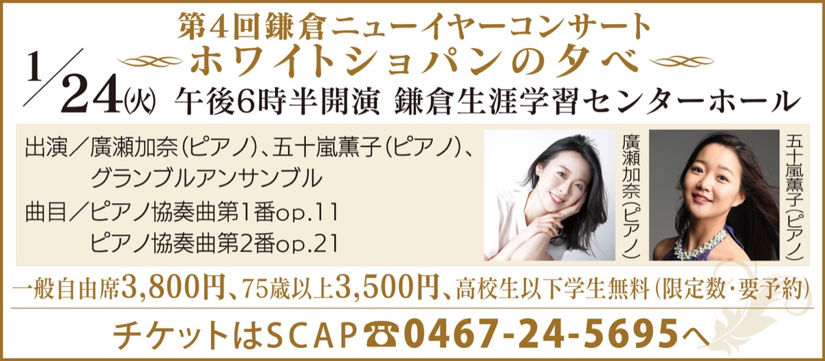 NPO法人湘南クラシックアーティストパラダイスの恒例の鎌倉ニューイヤーコンサートも4回目を迎えます。「年末の第9」に対抗して「年始にショパンを」という思いで始めました。明るい希望をイメージした今年は、河合楽器製作所より透明なクリスタルピアノをお借りして「ホワイトショパン」と名付け開催します。このピアノはXJAPANのYOSHIKIさんが使用し有名になりました。