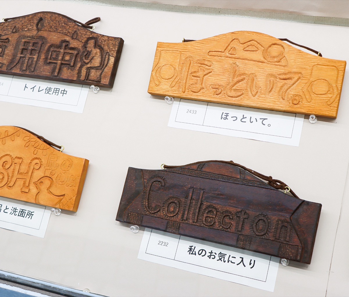 16日から23日(月)午後2時頃までは、岩瀬中などの作品が飾られている。同校2年生が美術の授業で制作した木彫のウェルカムボードでは、「演奏中」「休憩中」という文字を彫刻刀で表現したほか、「ほっといて」「はいるな」といった思春期ならではの作品も並ぶ。