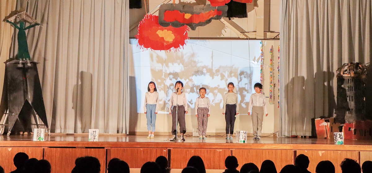 児童たちは朗読劇の練習に加え、原爆の子の像などの大道具も制作。12月には保護者へ朗読劇を発表し、1月16日からは他学年の児童に向けて順次披露している。
