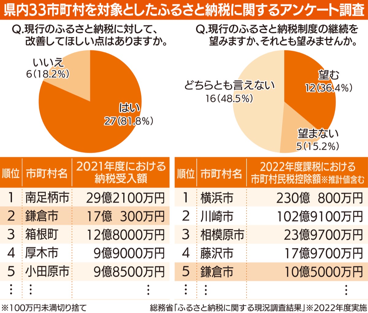 現行制度に対し、改善してほしいかとの問いに「はい」と答えたのは鎌倉市や3政令市を含む27自治体で、81・8%を占めた。背景には納税で寄付を受けた分から税収が減った分や経費を差し引いた収支が、多くの自治体で赤字となっている実態などが影響していると思われる。