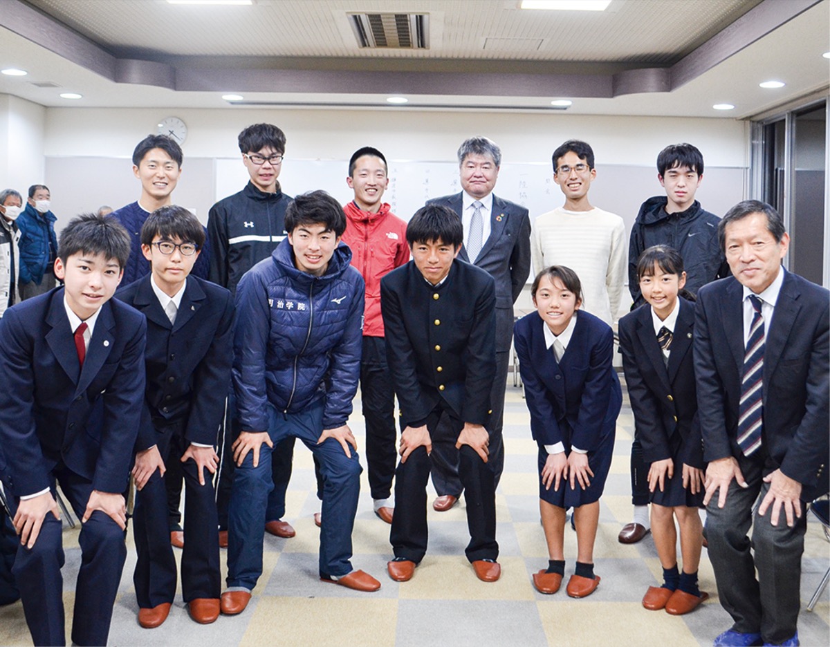 県内各市町村の代表選手がたすきをつなぐ「第77回市町村対抗『かながわ駅伝』競走大会」が2月12日(日)、丹沢湖周回コースで開催される。鎌倉市チームは、中学生〜社会人までの男女14人を選出。20日には鎌倉武道館で壮行会が行われ、選手たちが激走を誓った=写真。