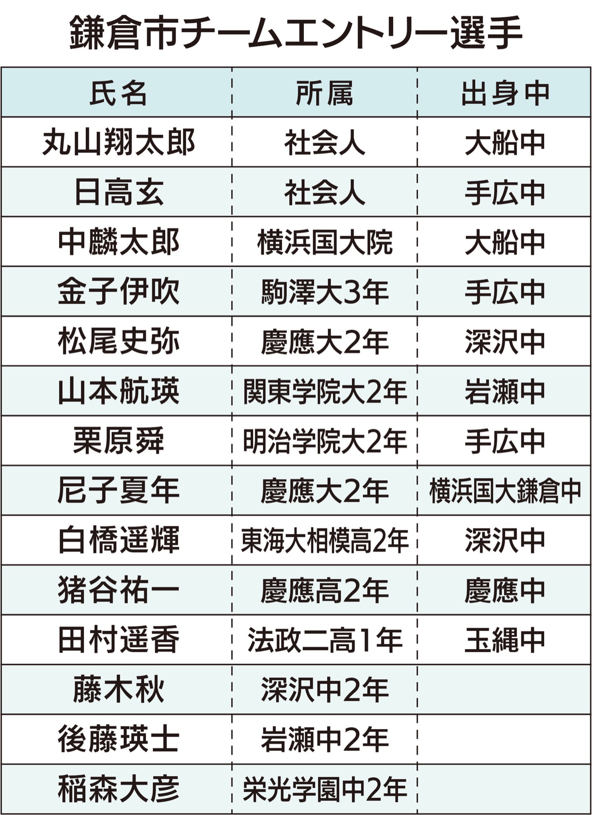 前回大会で鎌倉市は、過去最高の6位入賞を果たし、政令市などの上位常連チームを相手に健闘した。監督の池田克行さん(59)は、「鎌倉殿の13人、ならぬ14人全員で5位以内」と目標を宣言し、過去最高成績の更新を目指す。