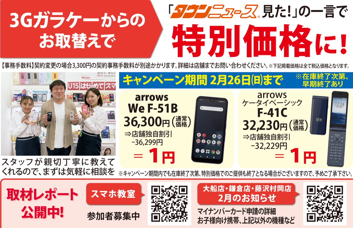また、従来の折り畳み式携帯電話のサービス終了も迫っている。ガラケーから機種変更時に「タウンニュースを見た!」の一言で、人気の携帯機種=写真=が特別価格に。ぜひ検討を。