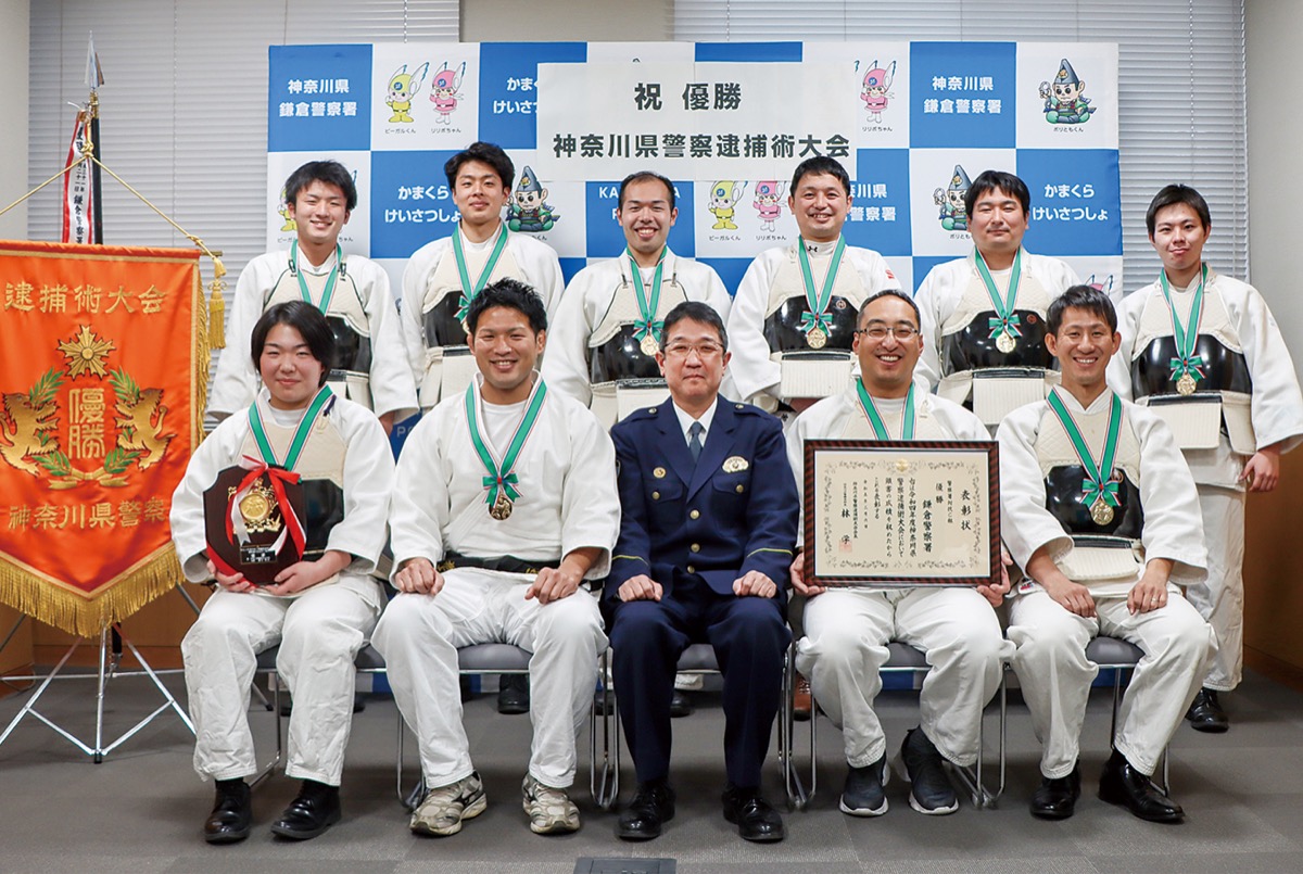鎌倉署は初戦で泉署を退け、田浦署、葉山署を破って決勝へ。瀬谷署との試合は2勝2敗2分で並ぶも、獲得した本数の差で勝利し、3年間の中止を挟んで2019年に続く連覇を成し遂げた。4年前の優勝メンバーで、大将として全勝した岩崎大輔さん(47)は、「先鋒からいい流れで私のところまで持ってきてくれた。チームワークの勝利」と喜んだ。