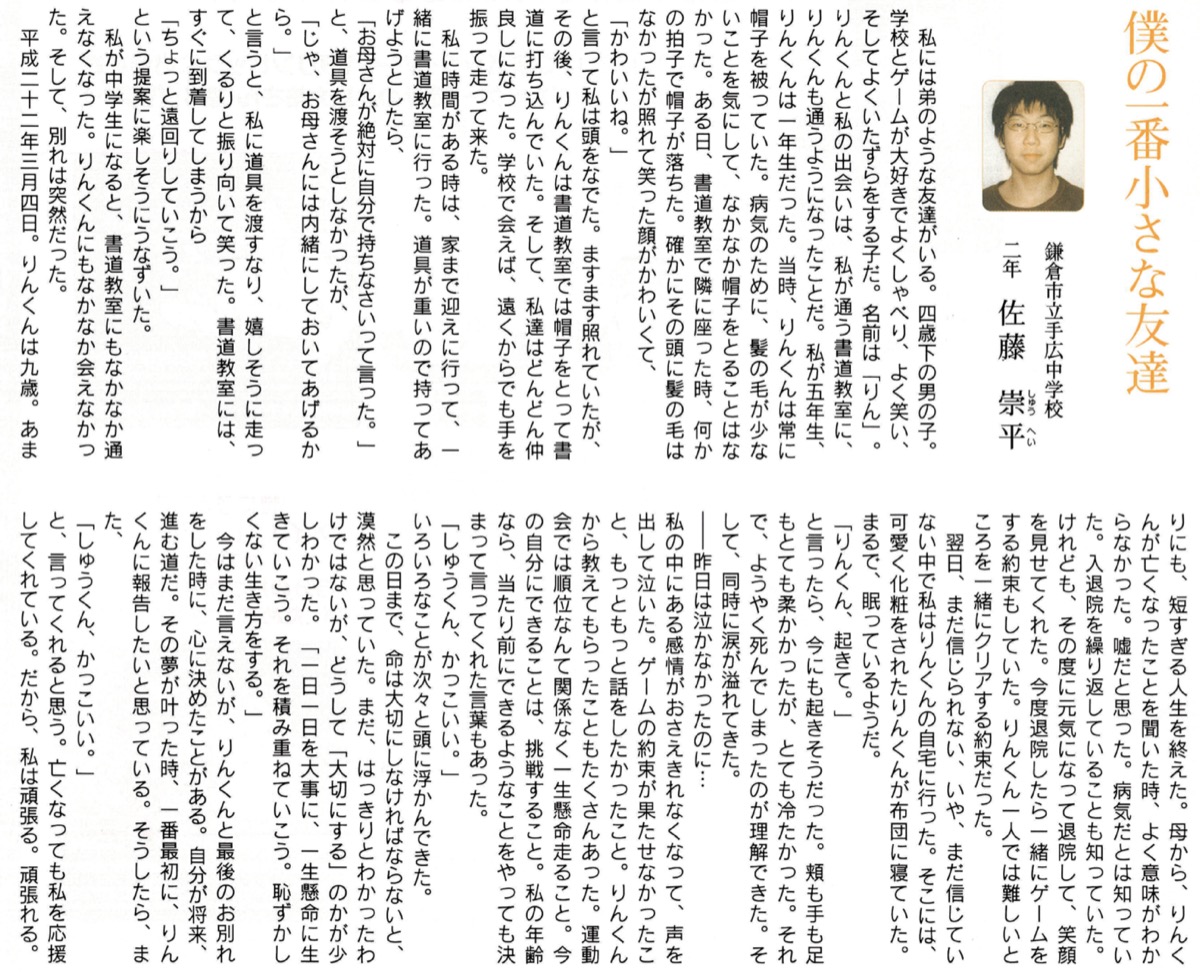 2010年3月4日、当時・手広中学1年だった佐藤崇平(しゅうへい)さんは、弟のようにかわいがっていた近所の友達・瀬川凜君(享年9歳)を小児がんで失った。あれから13年-。26歳となった佐藤さんは命日の4日、今は横浜で暮らす瀬川さんの自宅を訪れ、凜君の遺影に向かい手を合わせた。「りん、4月からついに小児科医になるよ」。佐藤さんは、凜君他界から半年後に書いた作文(=左下)で具体的に明かしてはいなかったが、友の死を受けて小児科医になることを決め、夢が叶った時には報告に行くことを誓っていた。