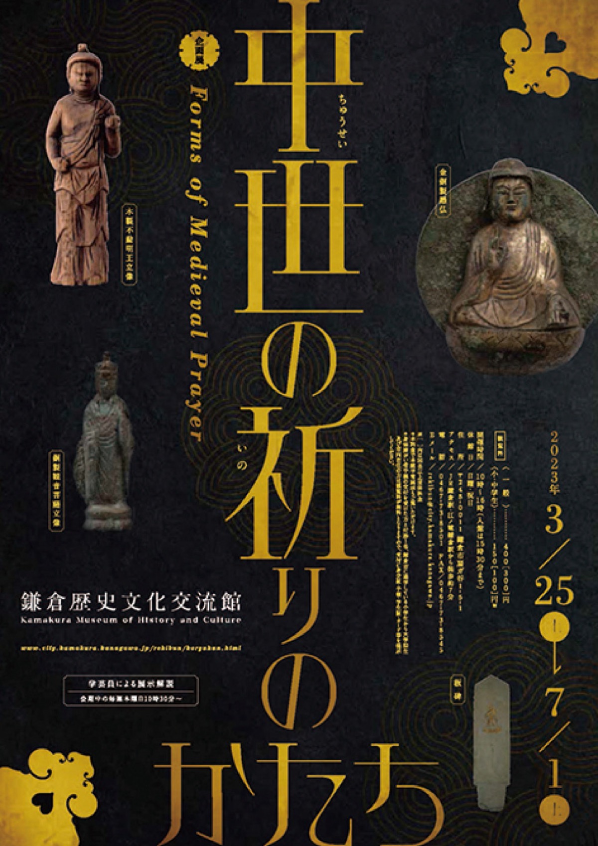 市内の発掘調査により、寺院や武家屋敷、庶民が住んでいた地域などから人々の信仰を物語る品々が発見されている。同展では、中世のさまざまな仏具や仏像の仏教関連資料を中心に、中世の人々がどのようにして仏に願っていたのかを掘り上げる。