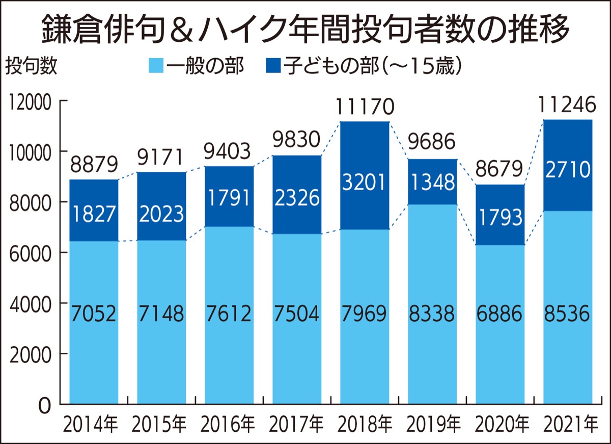 鎌倉俳句&ハイクの居住地別投句者の割合(2014〜18年度発表)は、県外を含めた市外からが95%を占め、市内は4%ほど。観光客や遠足・修学旅行で訪れた児童と学生が、応募数を底上げしている。実行委員会事務局は、「最近は20代の投句も増えている印象がある」と話し、子どもから高齢者まで幅広い世代が俳句に親しんでいることが伺える。