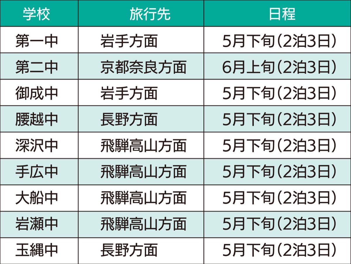 本紙では、市立中学校9校の2023年の修学旅行先を調査。結果は、飛騨高山方面が4校(深沢・手広・大船・岩瀬)と最多で、続いて岩手方面2校(第一・御成)、長野方面2校(腰越・玉縄)、京都奈良方面が1校(第二)だった。実施時期は5月下旬から6月上旬に集中し、全校が2泊3日の日程だ。